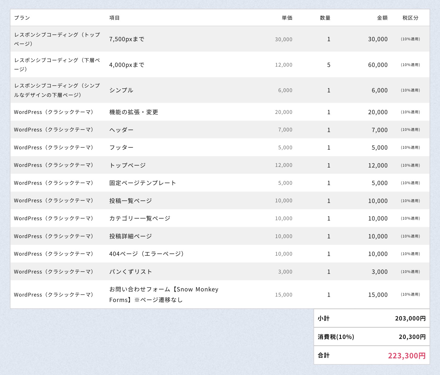 上記にカスタム投稿×1種類、JavaScriptアニメーション×3〜4種類を含めると、30万程度のお見積もりになることが多いです。